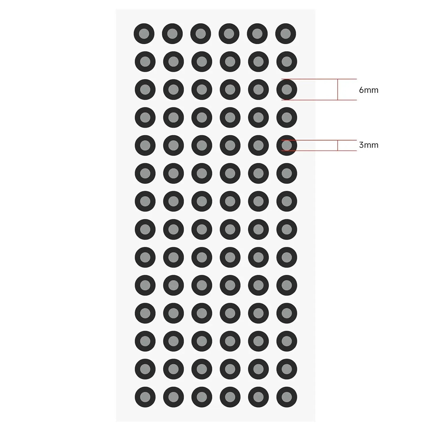 - Two size & pack options: 3mm inner / 6mm outer — 5 sheets × 98 per sheet (490 dots); 6mm inner / 10mm outer — 5 sheets × 50 per sheet (250 dots).